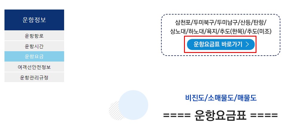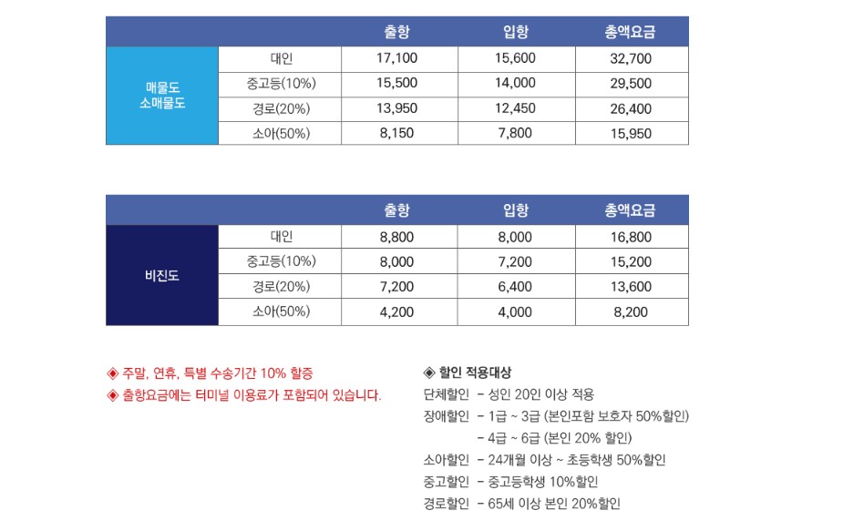 통영여객선터미널 시간표를 확인했으니 다음은 운항요금을 알아볼 차례가 아닌가 싶은데요. 매물도, 소매물도, 비진도 운항요금만 확인하도록 할게요. 다른 노선의 운행요금은 시간표와 비슷하게 [삼천포 / 두미북구 / 두미남구 / 산등 / 탄항 / 상노대 / 하노대 / 욕지 / 추도(한목) / 추도(미조) 운항요금표 바로가기]를 통해 쉽게 확인할 수 있습니다.