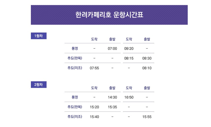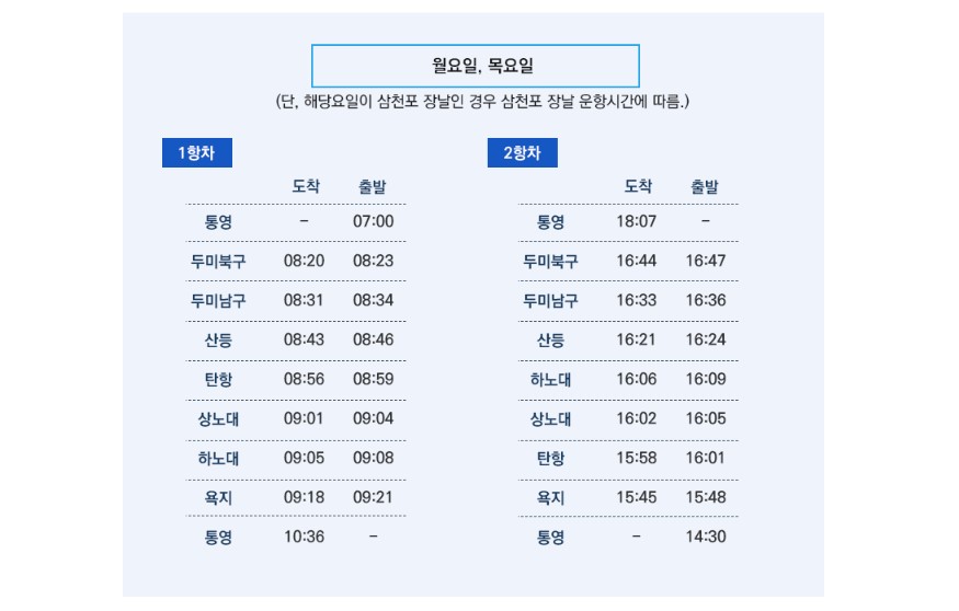 삼천포 / 두미북구 / 두미남구 / 산등 / 탄항 / 상노대 / 하노대 / 욕지 / 추도(한목) / 추도(미조) 운항시간표는 설명은 생략하고 사진을 첨부할태니 확인해주세요.