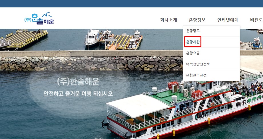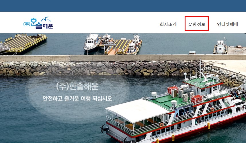 이렇게 한솔해운 사이트에 접속하면 상단메뉴 중 [운항정보]를 확인할 수 있는데요. 이곳에 마우스를 가져가 하위메뉴를 불러오고 여기서 [운항시간]을 찾아 클릭합니다. 그럼 간단히 통영여객선터미널 시간표를 확인할 수 있는데요. 어때요? 무척 간단하죠?