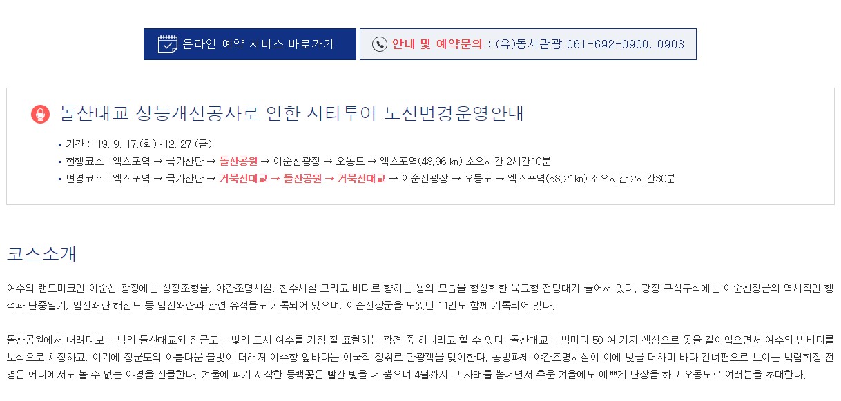낭만버스는 정해진 기간에만 운영되기 때문에 조금 아쉬운데요, 2019년의 경우 9월 17일에서 12월 27일까지만 운영한다고합니다. 요금은 9천원이며 초중고생이나 여수시민, 65세 이상인경우 4,500원을 내야합니다.