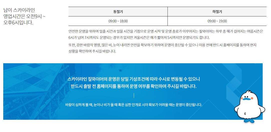 남이섬 짚와이어는 동절기와 하절기 운영시간에 차이가 있는데요. 동절기는 오전 9시 ~ 오후 6시까지 운영되고 하절기에는 오전 9시 ~ 오후 7시까지 짚와이어를 운영하고 있습니다. 하지만 명시된 운영시간과 달리 여름시즌에는 오후 7시 까지 운영하기도 하고 겨울시즌 해가 너무 짧다 싶으면 오후 5시까지 운영하는 등 운영시간은 탄력적으로 조정되는데요.