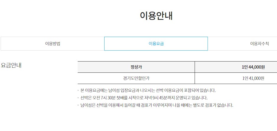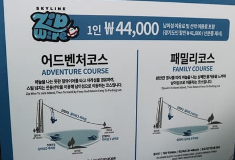워낙 규모가 크다 보니 남이섬 짚와이어 가격은 부담이 된다고 느낄 정도로 금액이 높은 편인데요. 1인 44,000원의 요금을 받고 있습니다. 경기도민일 경우 1인 41,000원으로 할인된 가격이 적용되는데요. 이 가격에는 남이섬을 나오는 선박 이용요금이 포함되어 있어 이중으로 돈이 들어갈 일은 없습니다.